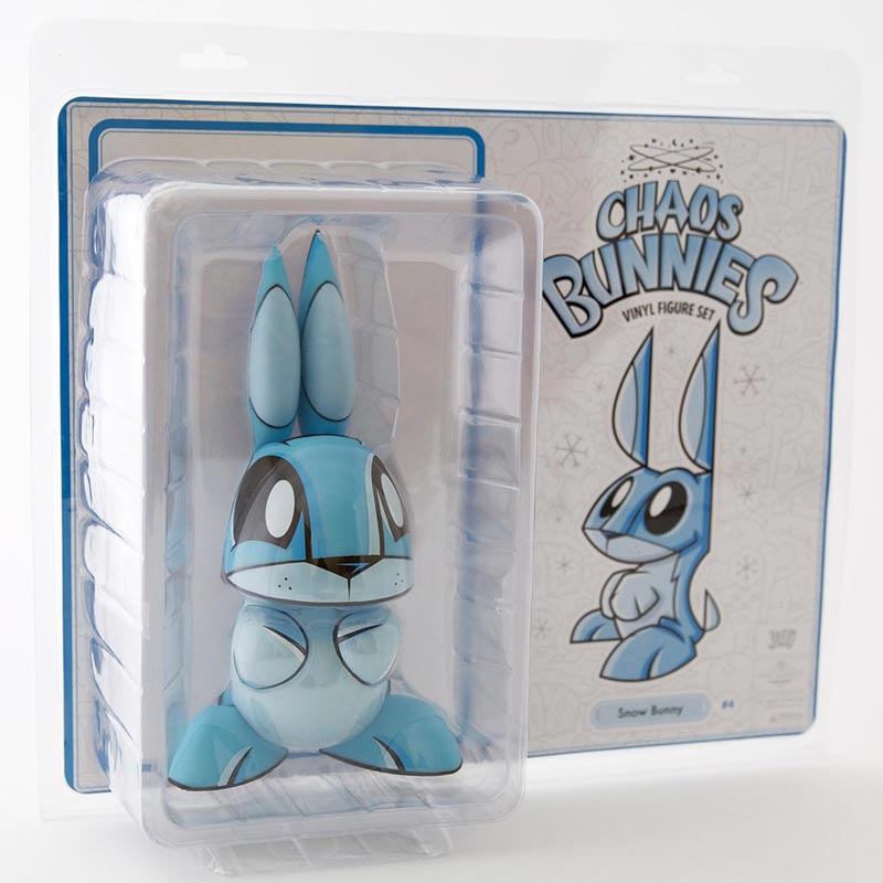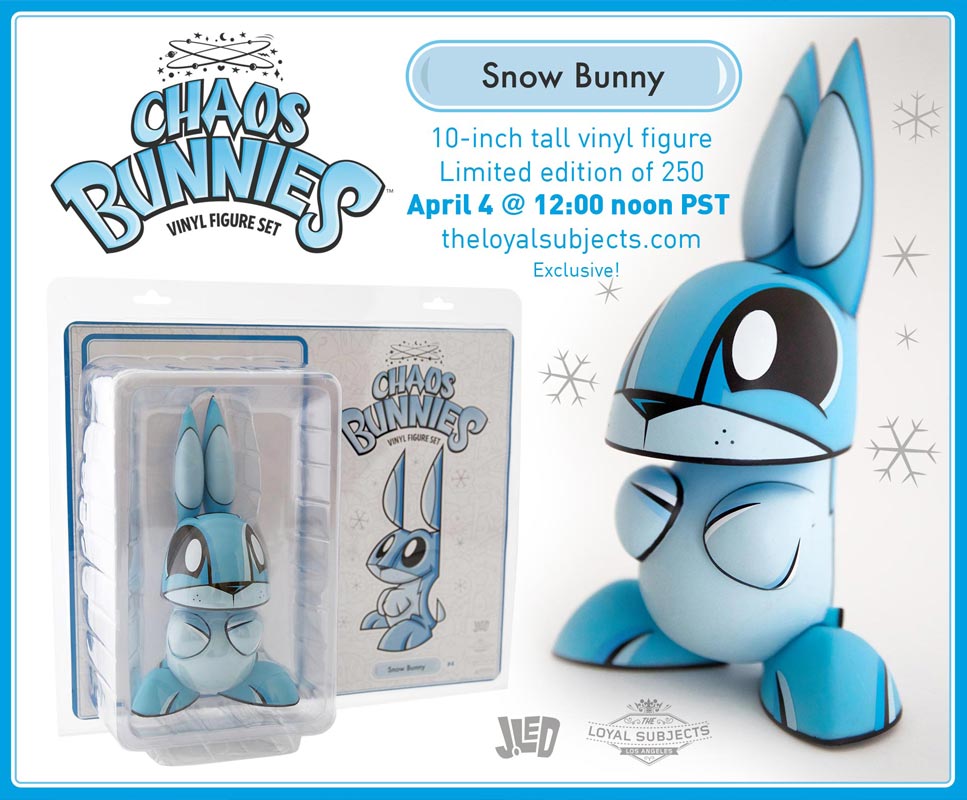 Well, winter is finally over and the Easter Bunny has come and gone, but there is still a chill in the air making it the perfect time for our next Chaos Bunnies release: Snow Bunny! Featuring the same vibrant blue colors Joe uses in all his “snow” edition figures, Snow Bunny will be a super cool addition to your collection. Limited to just 250 figures, Snow Bunny will be releasing this Thursday April 4, 2013 at 12 noon PST exclusively on theloyalsubjects.com. A 10-inch vinyl figure, Snow Bunny was created and designed by Joe Ledbetter, produced by The Loyal Subjects, and comes packaged in a fantastic jumbo-sized (and re-sealable) blister pack.